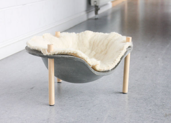 Cat bed made of UHPC concrete. This ultra strong concrete provides more design possibilities in form and thickness. The shape and materials of the basket are inspired by an animal burrow to achieve cosiness. The nest keeps your pet warm on cold days as well as cool on hot days.